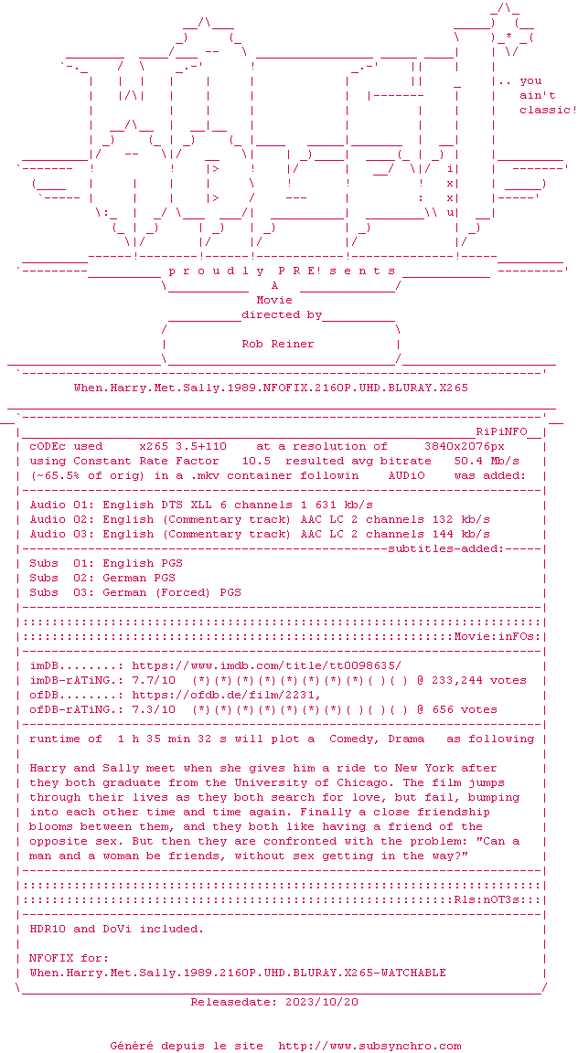 Voir le nfo de la release When.Harry.Met.Sally.1989.2160P.UHD.BLURAY.x265-WATCHABLE