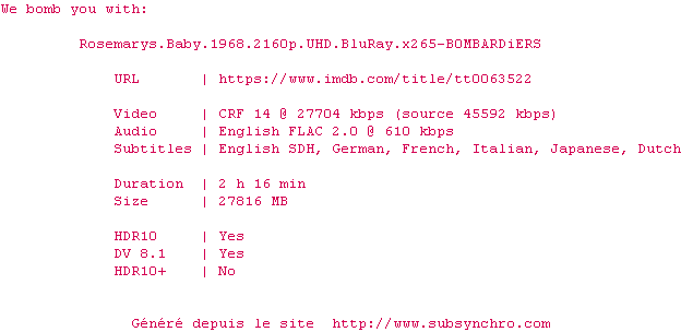 Voir le nfo de la release Rosemarys.Baby.1968.2160p.UHD.BluRay.x265-B0MBARDiERS