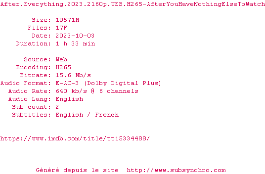 Voir le nfo de la release After.Everything.2023.2160p.WEB.H265-AfterYouHaveNothingElseToWatch