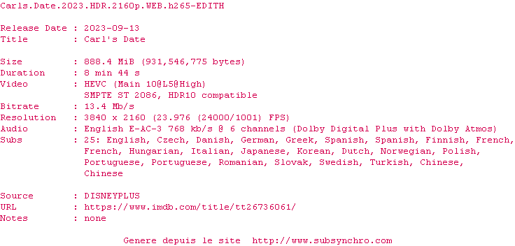 Voir le nfo de la release Carls.Date.2023.HDR.2160p.WEB.H265-EDITH