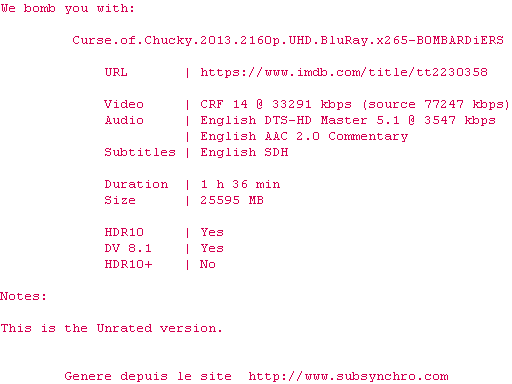 Voir le nfo de la release Curse.Of.Chucky.2013.2160p.UHD.BluRay.x265-B0MBARDiERS