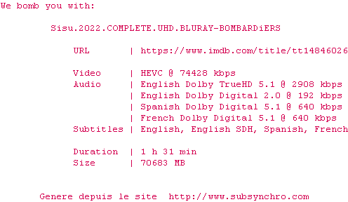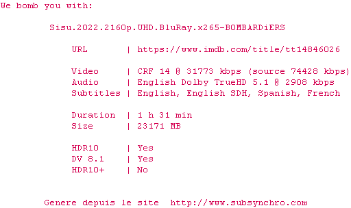 Voir le nfo de la release Sisu.2022.2160p.UHD.BluRay.x265-B0MBARDiERS