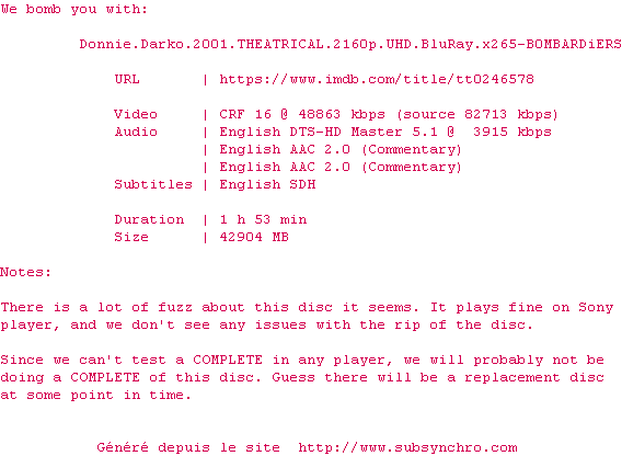 La release Donnie.Darko.2001.DC.2160p.UHD.BluRay.x265.10bit.HDR.DTS-HD.MA.5.1-SWTYBLZ est en 4K
