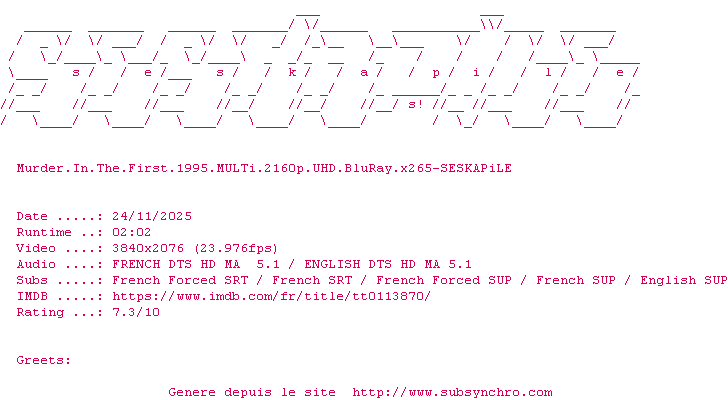 Voir le nfo de la release Murder.In.The.First.1995.MULTi.2160p.UHD.BluRay.x265-SESKAPiLE
