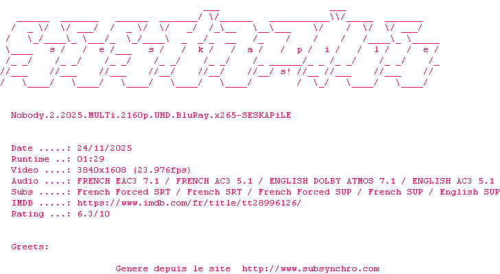 Voir le nfo de la release Nobody.2.2025.MULTi.2160p.UHD.BluRay.x265-SESKAPiLE
