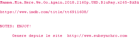 Voir le nfo de la release Mamma.Mia.Here.We.Go.Again.2018.2160p.UHD.BluRay.x265-BABA