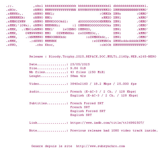 Voir le nfo de la release Bloody.Trophy.2025.REPACK.DOC.MULTi.2160p.WEB.x265-NERO