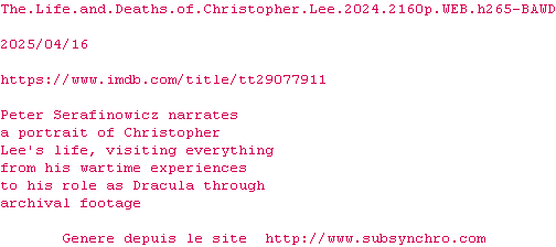 Voir le nfo de la release The.Life.And.Deaths.Of.Christopher.Lee.2024.2160p.WEB.H265-BAWD