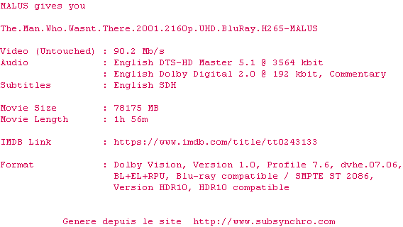 Voir le nfo de la release The.Man.Who.Wasnt.There.2001.2160p.UHD.BluRay.H265-MALUS