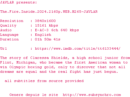 Voir le nfo de la release The.Fire.Inside.2024.2160p.WEB.H265-JAVLAR