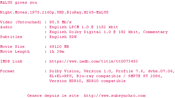 Voir le nfo de la release Night.Moves.1975.2160p.UHD.BluRay.H265-MALUS