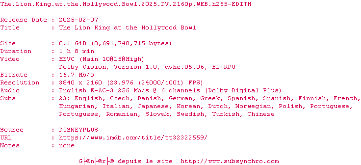 Voir le nfo de la release The.Lion.King.At.The.Hollywood.Bowl.2025.DV.2160p.WEB.H265-EDITH