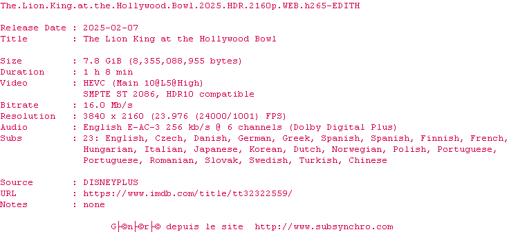Voir le nfo de la release The.Lion.King.At.The.Hollywood.Bowl.2025.HDR.2160p.WEB.H265-EDITH
