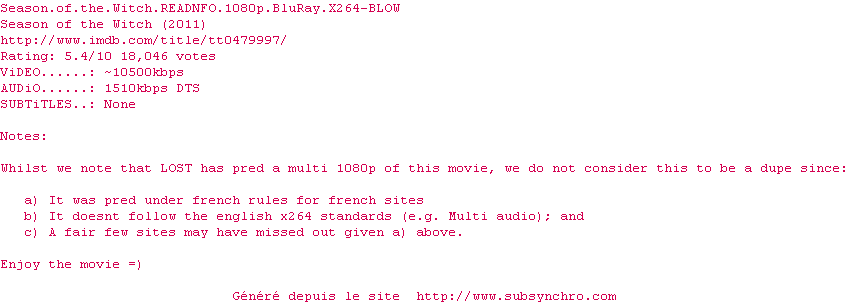 Voir le nfo de la release Season.of.the.Witch.READNFO.1080p.BluRay.X264-BLOW