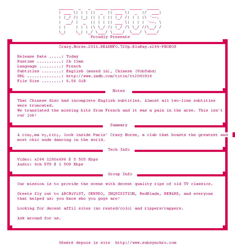 Voir le nfo de la release Crazy.Horse.2011.READNFO.720p.BluRay.x264-PHOBOS