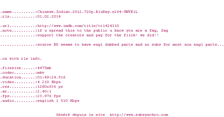 Voir le nfo de la release Chinese.Zodiac.2012.RERiP.READ.NFO.BDRip.x264-UNVEiL
