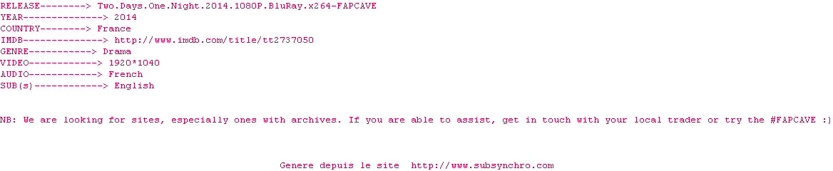 Voir le nfo de la release Two.Days.One.Night.2014.1080P.BluRay.x264-FAPCAVE