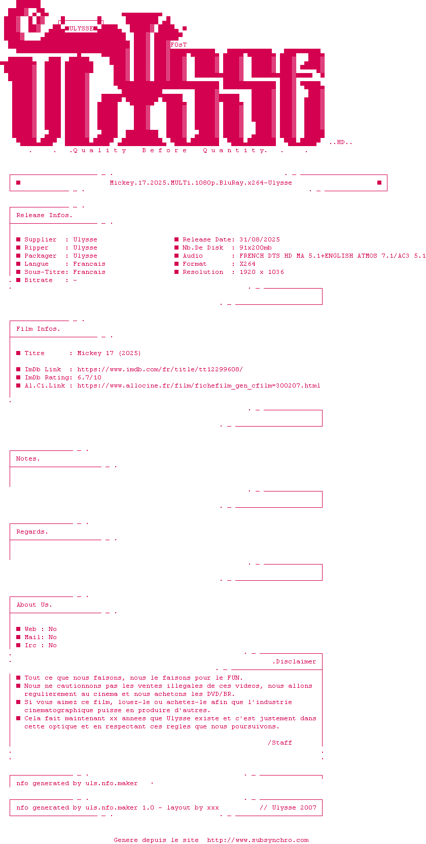 Voir le nfo de la release Mickey.17.2025.MULTi.1080p.BluRay.x264-Ulysse