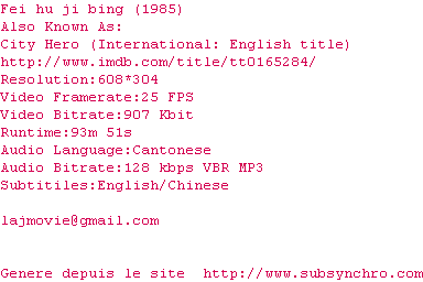Voir le nfo de la release City.Hero.1985.DVDRip.XviD-LAJ