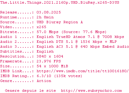 Voir le nfo de la release The.Little.Things.2021.2160p.UHD.BluRay.x265-D3US