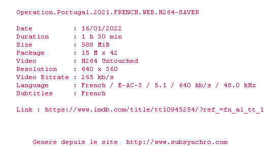 Voir le nfo de la release Operation.Portugal.2021.FRENCH.WEB.H264-SAVER