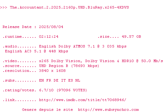 Voir le nfo de la release The.Accountant.2.2025.2160p.UHD.BluRay.H265-WOU