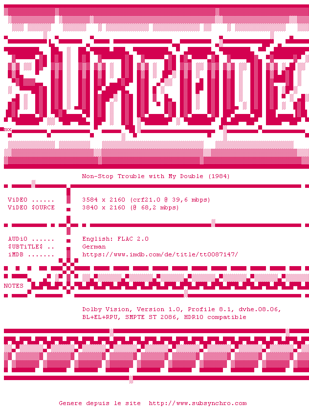 Voir le nfo de la release Non.Stop.Trouble.With.My.Double.1984.DUBBED.2160p.UHD.BluRay.x265-SURCODE