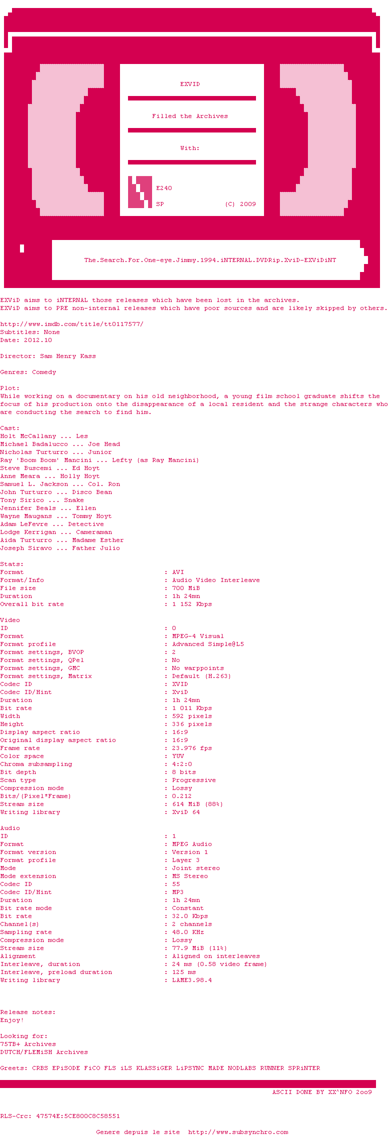 Voir le nfo de la release The.Search.For.One-eye.Jimmy.1994.iNTERNAL.DVDRip.XviD-EXViDiNT