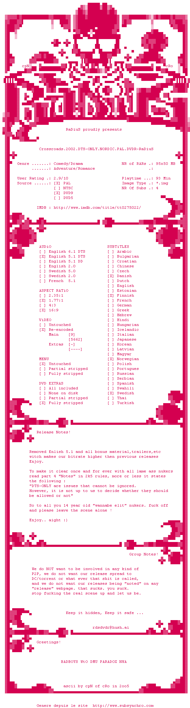Voir le nfo de la release CQ.2001.PAL.FRENCH.DVDR-PROUT