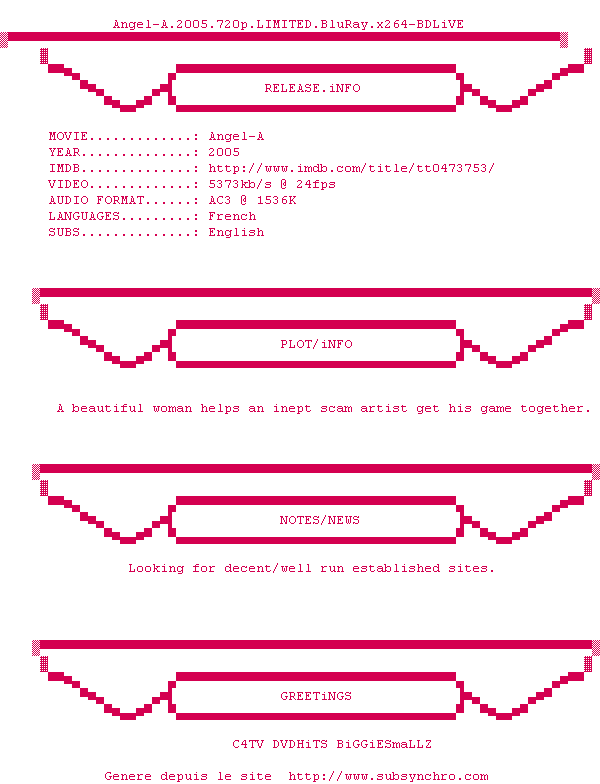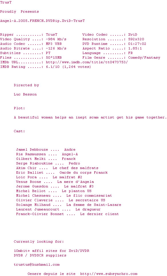 Voir le nfo de la release Angel-A.2005.FRENCH.DVDRip.XviD-TrusT