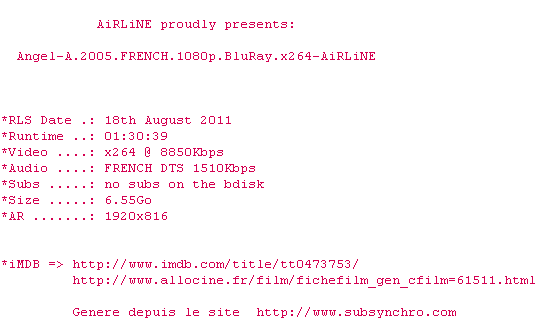 Voir le nfo de la release Angel-A.2005.FRENCH.1080p.BluRay.x264-AiRLiNE