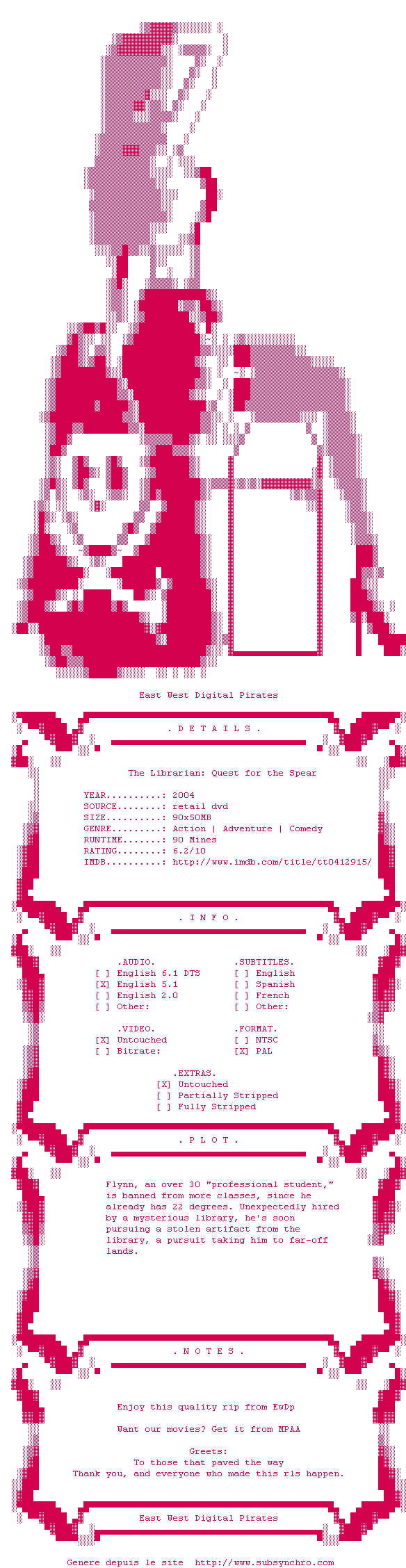 Voir le nfo de la release The.Librarian.Quest.For.The.Spear.2004.WS.PAL.COMPLETE.DVDR.INT-EwDp