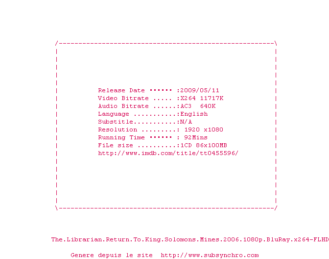 Voir le nfo de la release The.Librarian.Return.To.King.Solomons.Mines.2006.1080p.BluRay.x264-FLHD