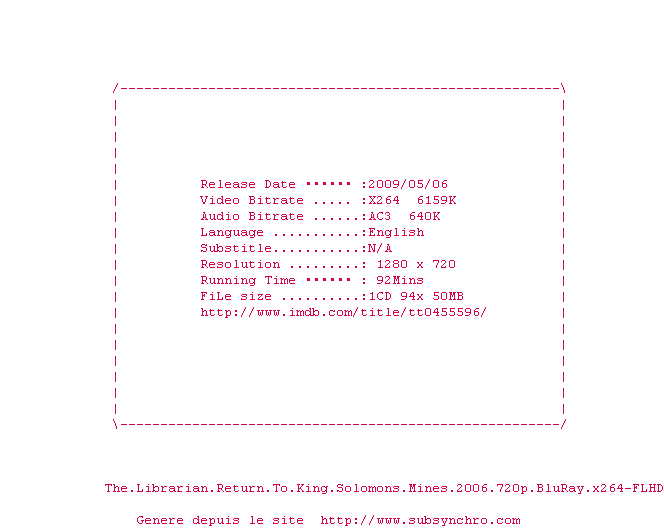 Voir le nfo de la release The.Librarian.Return.To.King.Solomons.Mines.2006.720p.BluRay.x264-FLHD