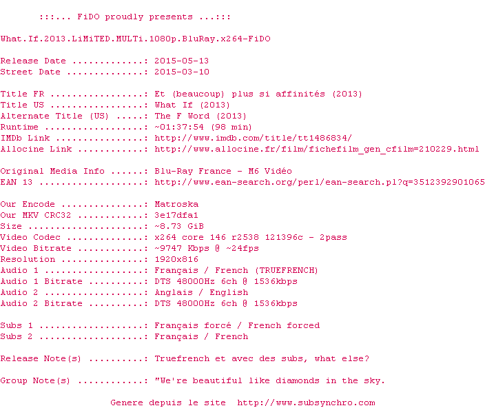 Voir le nfo de la release What.If.2013.LiMiTED.MULTi.1080p.BluRay.x264-FiDO