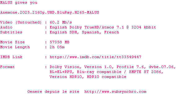La release Anemone.2025.Hybrid.2160p.WEB-DL.DV.HDR.DDP5.1.Atmos.H265-AOC-VETEMSHQIP est en 4K
