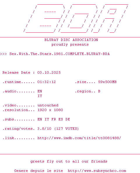 Voir le nfo de la release Sex.With.The.Stars.1981.COMPLETE.BLURAY-BDA
