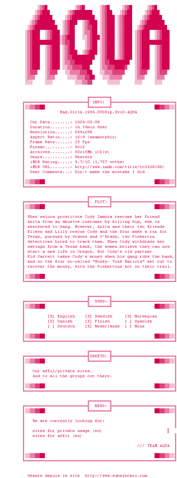Voir le nfo de la release Bad.Girls.1994.DVDRip.XviD-AQUA