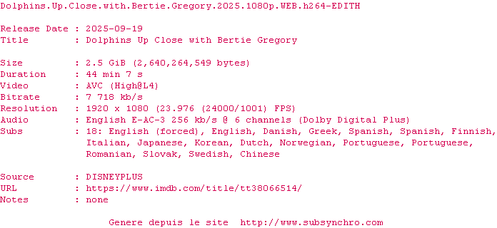 Voir le nfo de la release Dolphins.Up.Close.With.Bertie.Gregory.2025.HDR.2160p.WEB.H265-EDITH