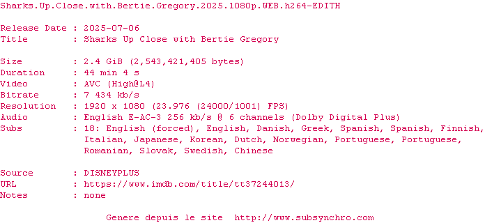 Voir le nfo de la release Sharks.Up.Close.With.Bertie.Gregory.2025.1080p.WEB.H264-EDITH