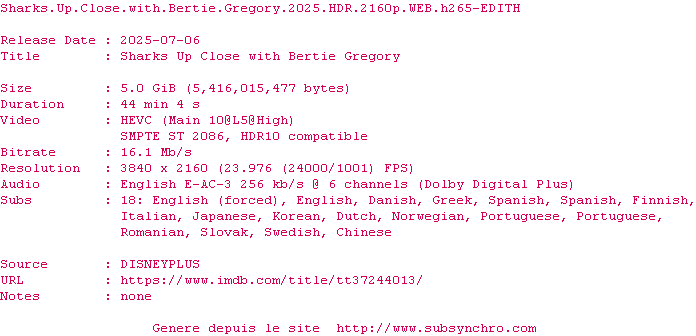 Voir le nfo de la release Sharks.Up.Close.With.Bertie.Gregory.2025.HDR.2160p.WEB.H265-EDITH