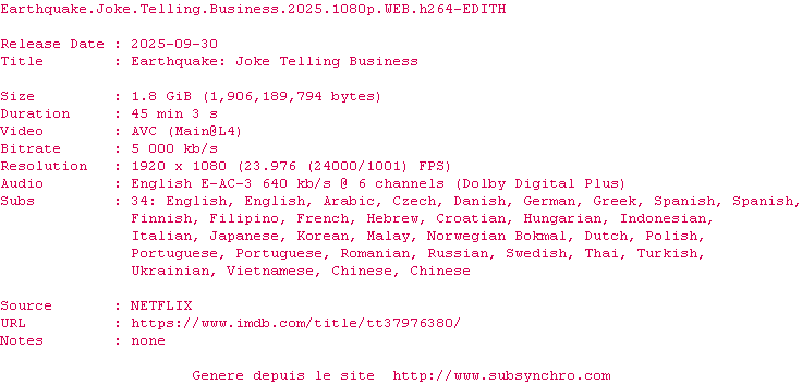 Voir le nfo de la release Earthquake.Joke.Telling.Business.2025.1080p.WEB.H264-EDITH