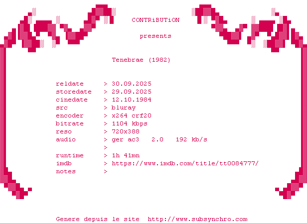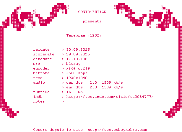 Voir le nfo de la release Tenebrae.1982.DUBBED.2160p.UHD.BluRay.H265-GAZPROM