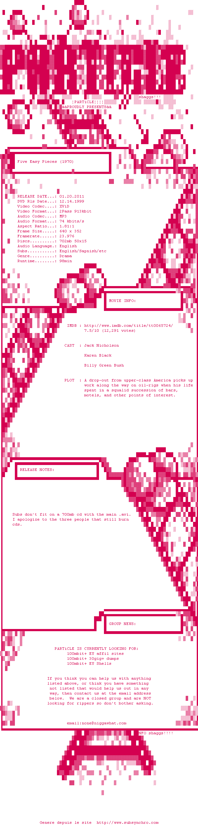 Voir le nfo de la release Five.Easy.Pieces.1970.iNTERNAL.DVDRip.XviD-PARTiCLE