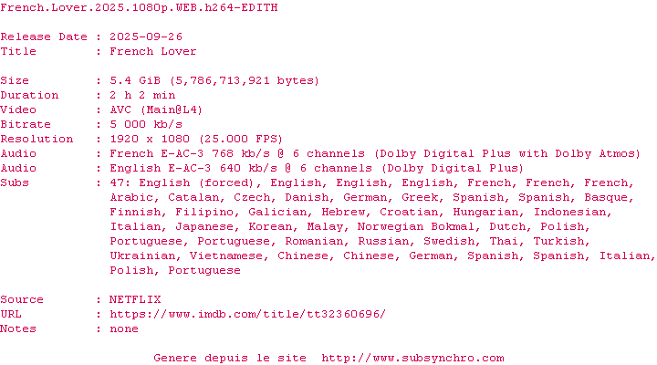 Voir le nfo de la release French.Lover.2025.1080p.WEB.H264-EDITH