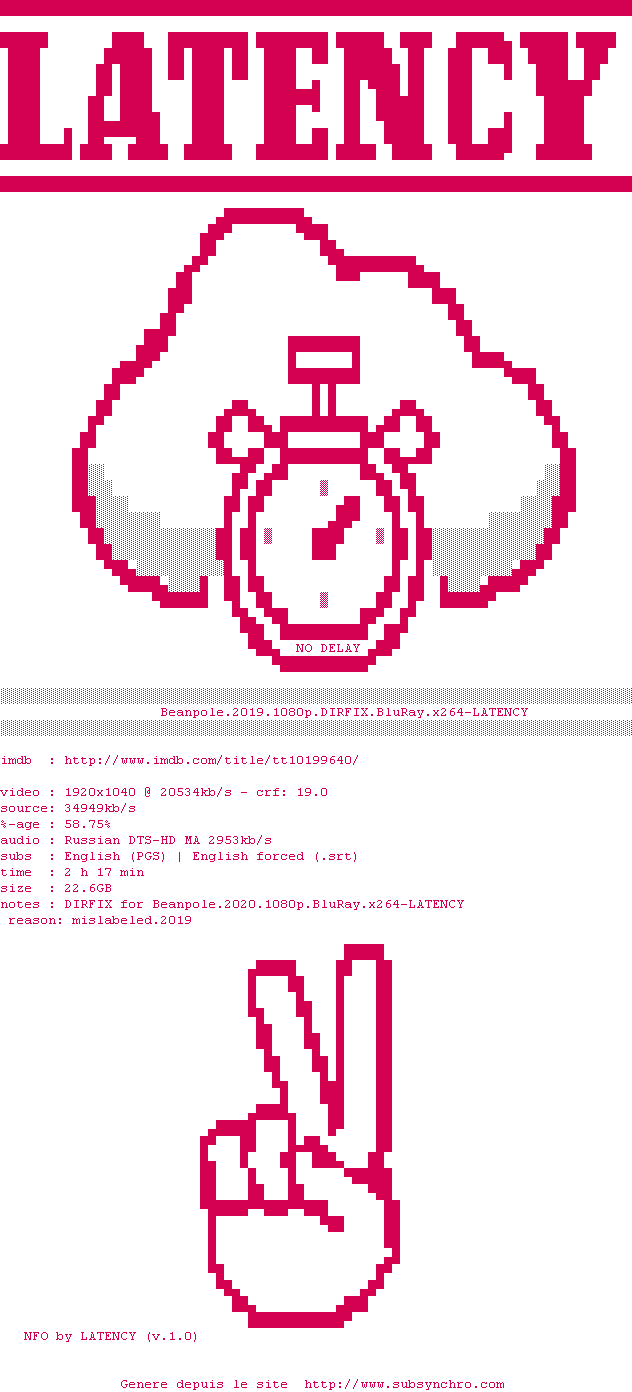 Voir le nfo de la release Beanpole.2019.1080p.BluRay.x264-LATENCY