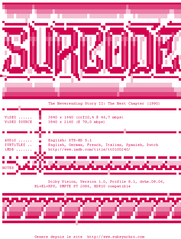 Voir le nfo de la release The.Neverending.Story.II.The.Next.Chapter.1990.2160p.UHD.BluRay.H265-GAZPROM