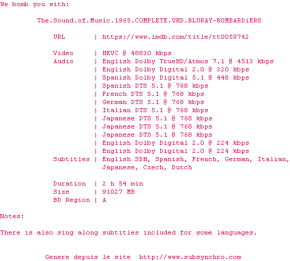 Voir le nfo de la release The.Sound.Of.Music.1965.2160p.UHD.BluRay.H265-MALUS