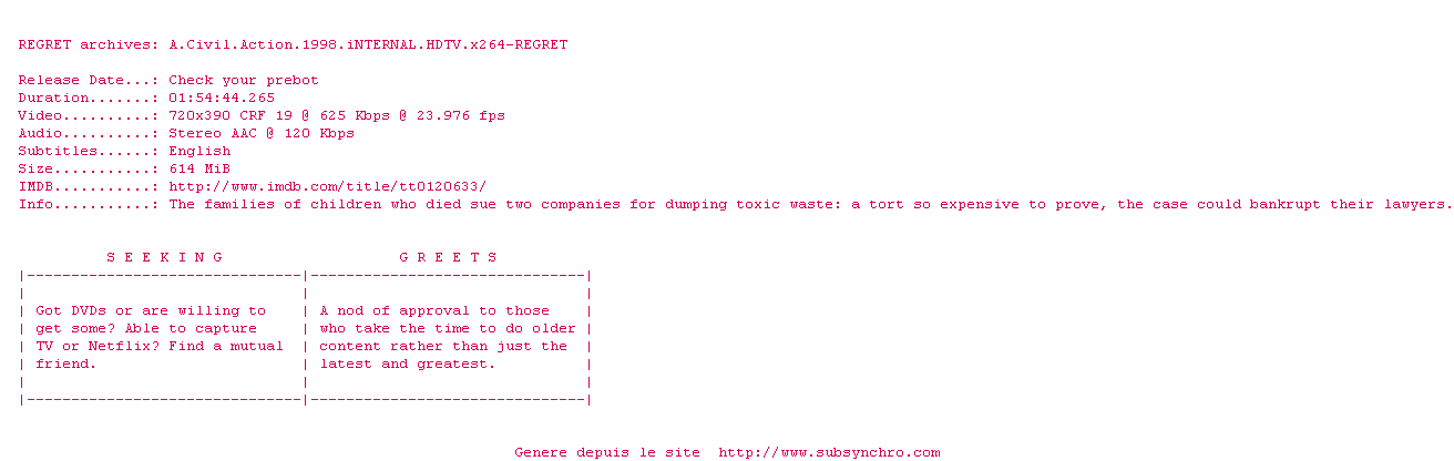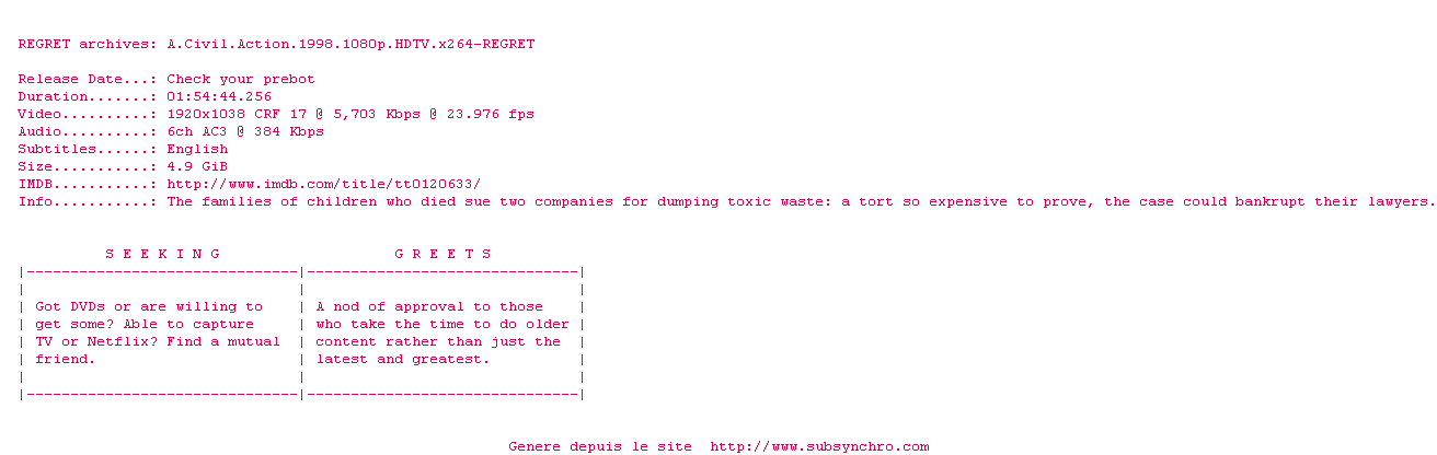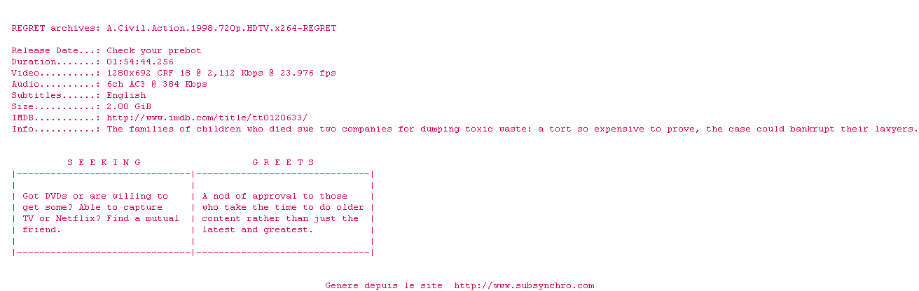 Voir le nfo de la release A.Civil.Action.1998.1080p.HDTV.x264-REGRET