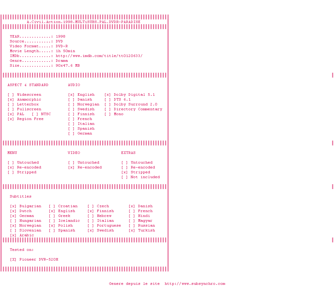 Voir le nfo de la release A.Civil.Action.1998.MULTiSUBS.PAL.DVDR-PARADISE